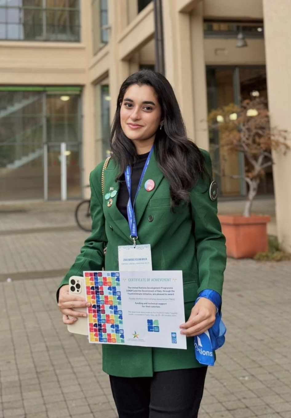 On a personal note, Malik was honoured to receive the Youth for Climate Award from the United Nations Development Programme (UNDP) and the Italian Ministry of Energy Security. This recognition made her the only Pakistani to represent Tayaba’s youth-powered climate action, focusing on environmental literacy and the development of innovative climate solutions, in Turin, Italy. She is now a proud member of the UNDP Youth4Climate Cohort 2024.